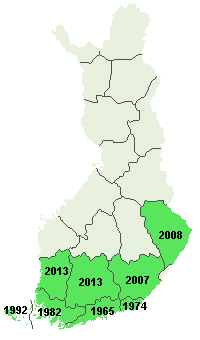 | Maakuntien havaintovuodet | Suomen hyönteistietokanta (10.3.2014) | ||||||||||||