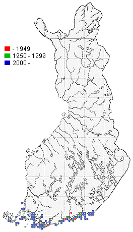| Havainto: | 1939, V: Karjalohja, 1 ex., A.Kaario leg. 8.7.1940, U: Pernaja Våtskär, 1 m, L.O.Törnvall leg. 14.7.1940, U: Pernaja Sarvisalo, 1 ex., T.Kontuniemi leg. 15.7.1940, U: Pernaja Sarvisalo, 1 m, Th.Grönblom leg. 1940, U: Pernaja Våtskär, 5 m 1 f, L.O.Törnvall leg. |