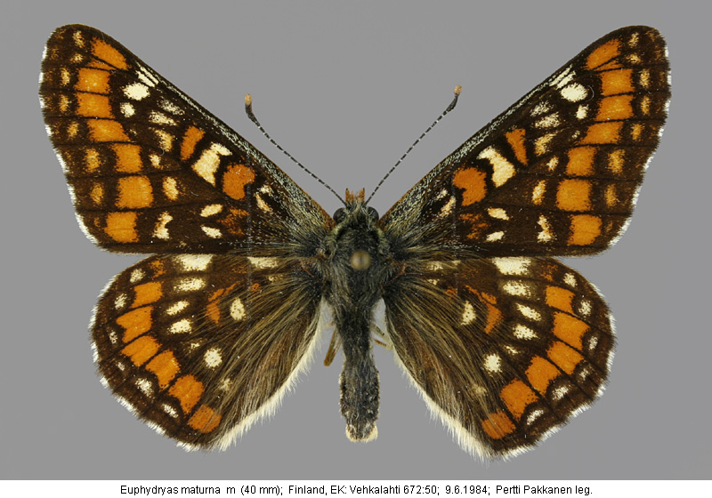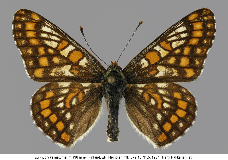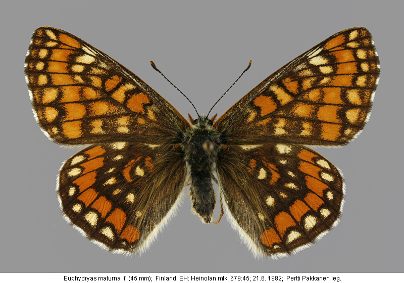 | Suomesta saaduiksi on ilmoitettu seuraavat muodot (alkuperäiset nimet): Euphydryas maturna - (Sotavalta 1980). - Etusiiven yläpuolen keskijuovan valkoiset täplät voivat olla keltaisia tai tumman kehnän peittämiä. - Itäänpäin mentäessä valkoiset kirjaukset vähitellen laajenevat (kliini), (idässä f.geogr. uralensis Staudinger) (huom. sivun kolmas malliyksilö) Hypodryas maturna - (Mikkola 1983). - kuvataulu 1 rivi 4. - etusiivet melko yksivärisen punervankeltaiset. - kirjailut paljolti häipyneet. - EH: Heinolan mlk, A.Järvelä leg. | ||||||||||||||||||||||||||||||