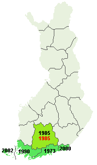 | 1993 muutama havainto ilmoitettiin jo Uudeltamaalta ja yksi havainto Korppoosta. 1996 useita havaintoja eri paikoista Uudeltamaalta. |