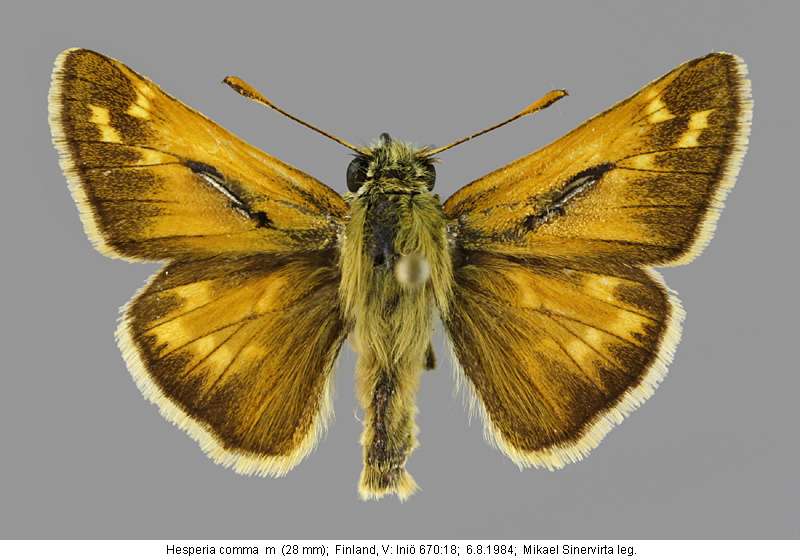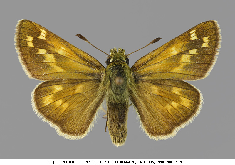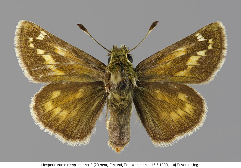 | Suomesta saaduiksi on ilmoitettu seuraavat muodot (alkuperäiset nimet): Hesperia comma var. catena Staud. - (Aro 1900). - takasiivet alta vahvemman viheriäiset, täplät valkeampia, mustareunaisia. - levinneisyysalueen koillisosissa, tavattu Venäjän Lapissa. (muotoa ei tunnettu vielä Suomesta). Augiades comma f.geogr. catena Stgr. - (Valle 1935). - vuoristomuoto, jota ei liene vielä tavattu meillä. - päämuotoa keskimäärin vähän pienempi. - päältä päämuotoa hiukan vaaleampi. - takasiivet alta voimakkaan vihreät, täplät puhtaan valkoiset, mustareunaiset. Hesperia comma ssp. catena - (Mannelin 1961). - kuvataulu 1, kuvat 27 ja 28. (yksilöt Ruotsin Lapista) Hesperia comma f. catena. - (Marttila et.al. 1990). - kuvataulu 2. Hesperia comma catena. - (Marttila 2005). - kuvataulu 1, kuvat 9Ba 9Bb 9Bc. | ||||||||||||||||||||||||||||||