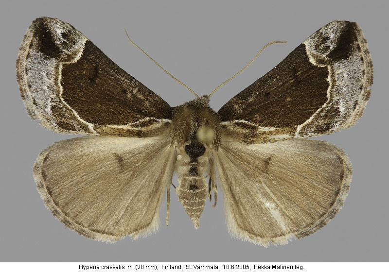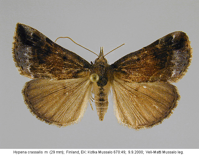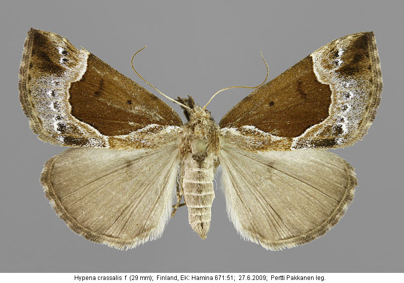 | Nykyinen voimassa oleva lajinimi - (Kullberg et. al. 2002): Hypena Schrank, 1802 crassalis (Fabricius, 1787) | ||||||||||||||