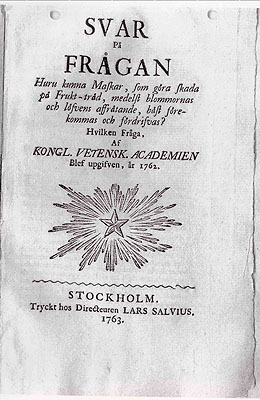 Kuninkaallisen tiedeakatemian kysely 1762 kuului seuraavasti: ”Huru kunna Maskar, som göra skada på Frukt-träd, medelst blommornas och löfvens affrätande, bäst förekommas och fördrifvas ?” | |