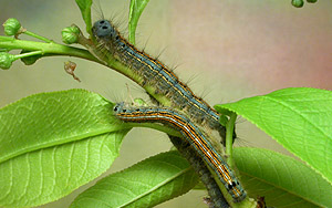 Leche kuvailee seuraavasti: Toukat syövät kaikki lehdet kaikista hedelmäpuulajikkeista. Niitä on helppo tunnistaa raidallisesta ulkonäöstään. Mustat, keltaiset ja siniset raidat sekä pienet karva-tupsut, (små hårbuskar) , selässä. Kesähelteellä ne kerääntyvät rungon tai isompien oksien varjo-puolelle, johon ovat seitistä kehränneet alustan oleskelua varten, (botten att sitta på). Näin niitä on siten helppo murskata. Mutta ne eivät esiinny kaikissa valtakunnan lääneissä. (Men desse finnas icke i alla provincier i Riket). Muninta tapahtuu spiraalin muotoisesti jonkin kuivan oksan ympärille, ja sen takia munat eivät yleensä saa olla talitiaisilta ja muilta tiaisilta rauhassa yli talven. |