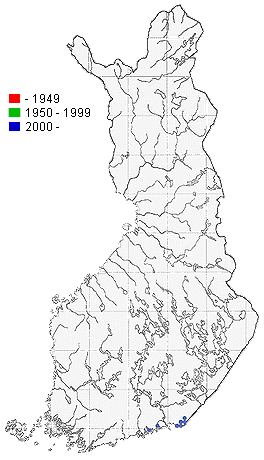 | Etelä-Suomi (A., V., U., EK., St., EH., ES., LK.) 8.-24.7.2012 EK: Virolahti 1 ex. H.Koski - (Suomen hyönteisten tietokanta) 13.-19.9.2001 U: Pernaja 1 ex. K.Rossi & E.Germano - (Suomen hyönteisten tietokanta) | ||||||||||||||