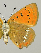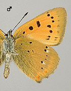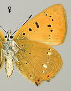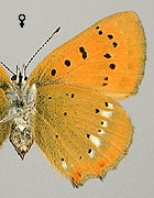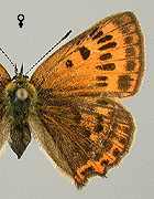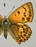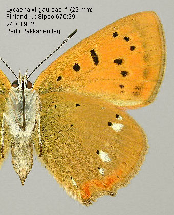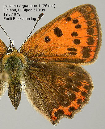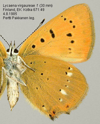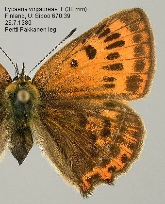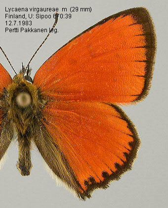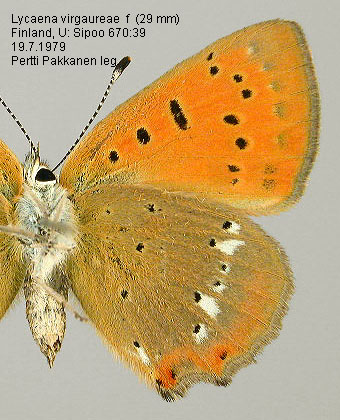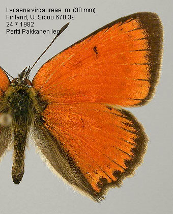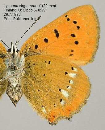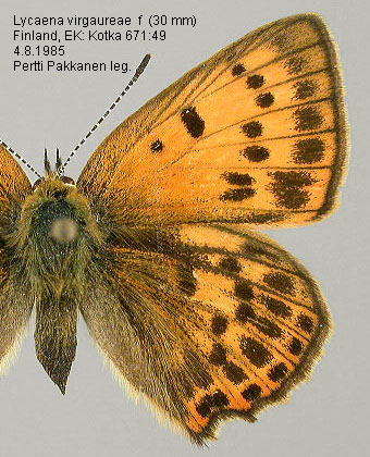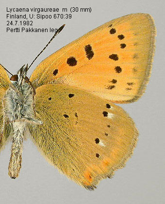 | Nykyinen voimassa oleva lajinimi - (Kullberg et. al. 2002): Lycaena Fabricius, 1807 virgaureae (Linnaeus, 1758) | ||||||||||||||||||||||||||
