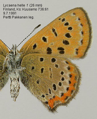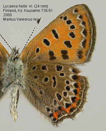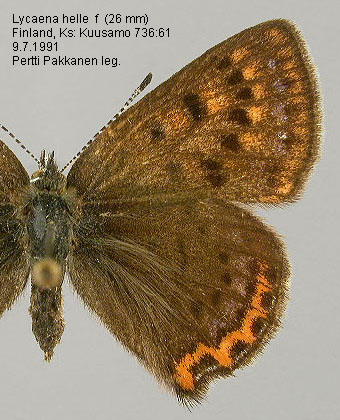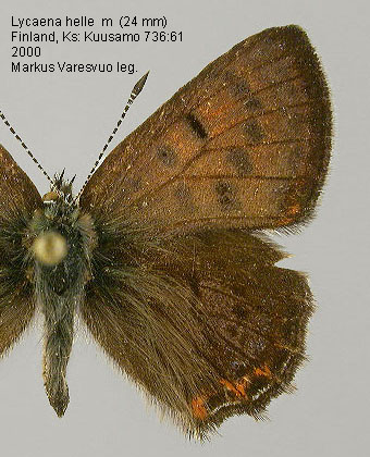 | Nykyinen voimassa oleva lajinimi - (Kullberg et. al. 2002): Lycaena Fabricius, 1807 helle (Denis & Schiffermüller, 1775) | ||||||||||||||||||||||||||