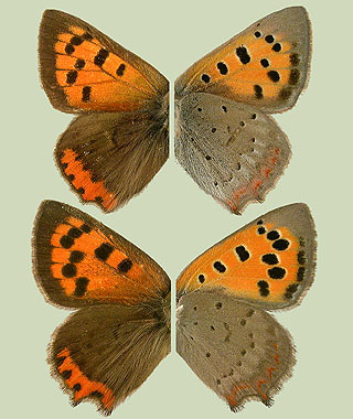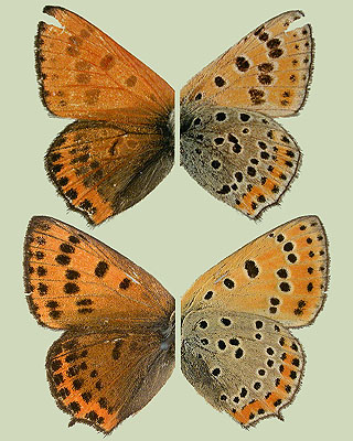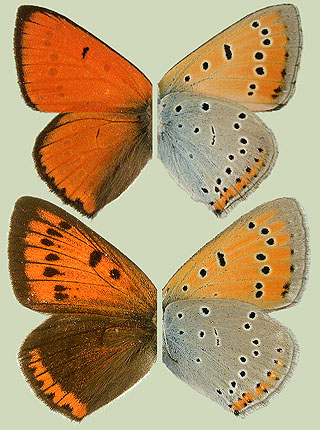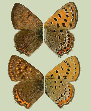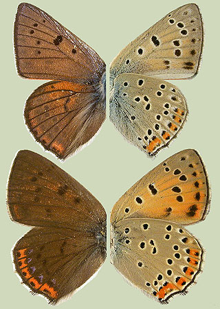 sekä sisä- että ulkopuolella ilman vaaleaa rajausta, vertaa L. helle, L. alciphron ja L. hippothoe