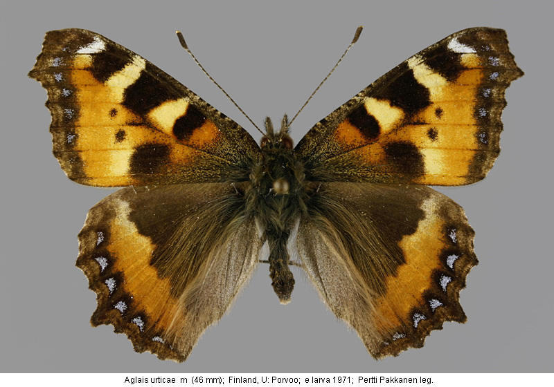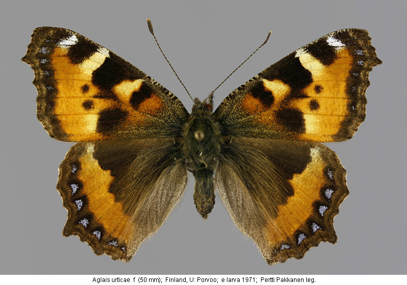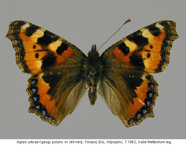 | Suomesta saaduiksi on ilmoitettu seuraavat muodot (alkuperäiset nimet): Vanessa urticae 'lämpömuoto' - (Federley 1914). - lennosta, 1912 Ekenäs. - laajempi kirjoitus lämpömuodoista. Vanessa urticae f.geogr. polaris Stgr. - (Valle 1935). - Päämuotoa hiukan pienempi, tummempi ja isompitäpläinen. - Lapissa (EnL, InL) vallitseva muoto. Vanessa urticae ab. atrebatensis B. - (Valle 1935). - Siipien yläpinta tummentunut, täplät suurentuneet ja reunatäplät osaksi uhteensulaneet. - Etusiipien siniset reunatäplät hävinneet. - Takasiivet melkein mustat. Vanessa urticae ab. alba Raynor. - (Valle 1935). - Kuten päämuoto, mutta pohjaväri luunvalkoinen. Vanessa urticae polaris Staudinger (1871) - (Petersen 1947). - tyyppiyksilö: Norja Tromsö. - tummat kuviot leveämpiä kuin nimimuodolla. Nymphalis urticae - (Kaitila et. al. 2005). - 'villi' yksilö, kosteus-kylmämuoto. - Lapinjärvi 13.5.1995. - kuva Juho Paukkunen. | ||||||||||||||||||||||||||||||