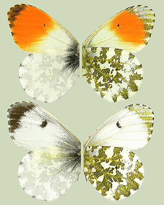 - takasiipien alapuoli molemmilla sukupuolilla samanlainen, vihreän ja valkoisen kirjava