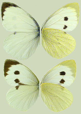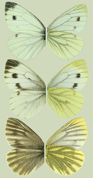 - etusiiven kärki musta ja täplä ulottuu katkeilevana alaspäin siiven puolenvälin, - vertaa P.brassicae ja P.rapae