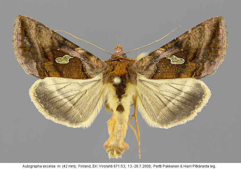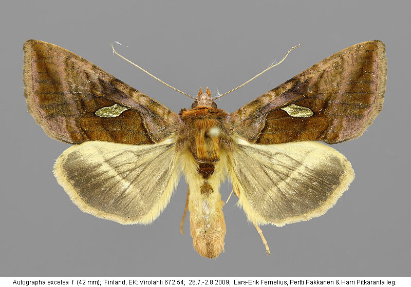 | Nykyinen voimassa oleva lajinimi - (Kullberg et. al. 2002): Autographa Hübner, 1821 excelsa (Kretschmar, 1862) | ||||||||||||||
