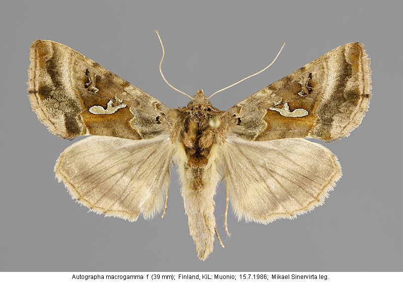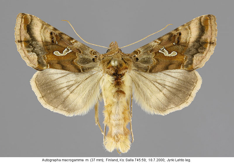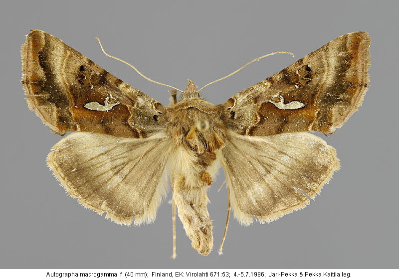 | Nykyinen voimassa oleva lajinimi - (Kullberg et. al. 2002): Autographa Hübner, 1821 macrogamma (Eversmann, 1842) | ||||||||||||||||||