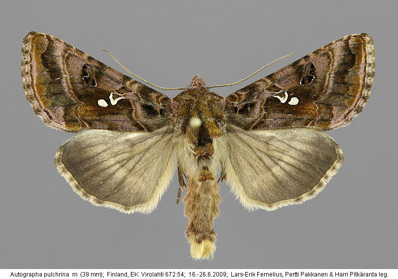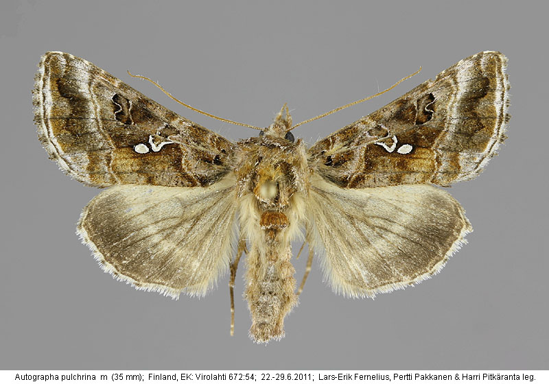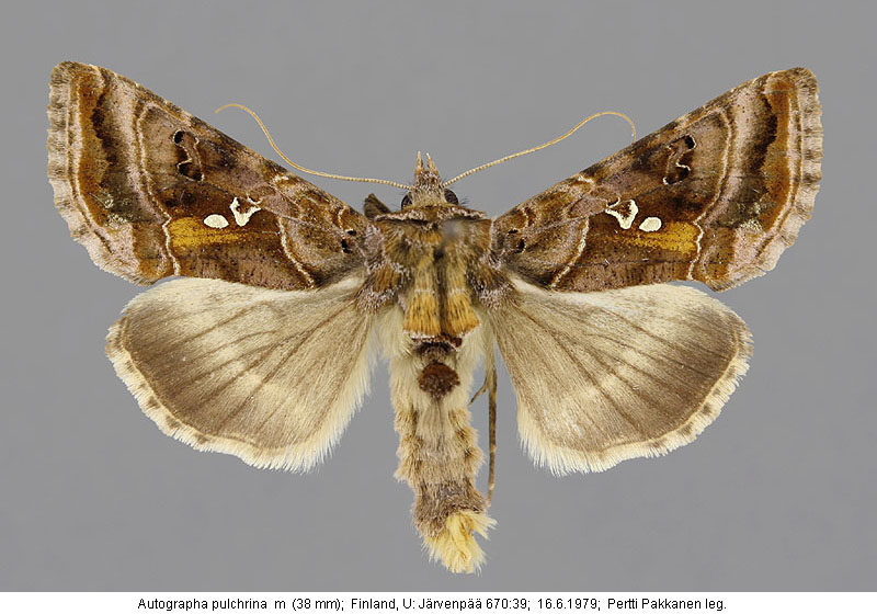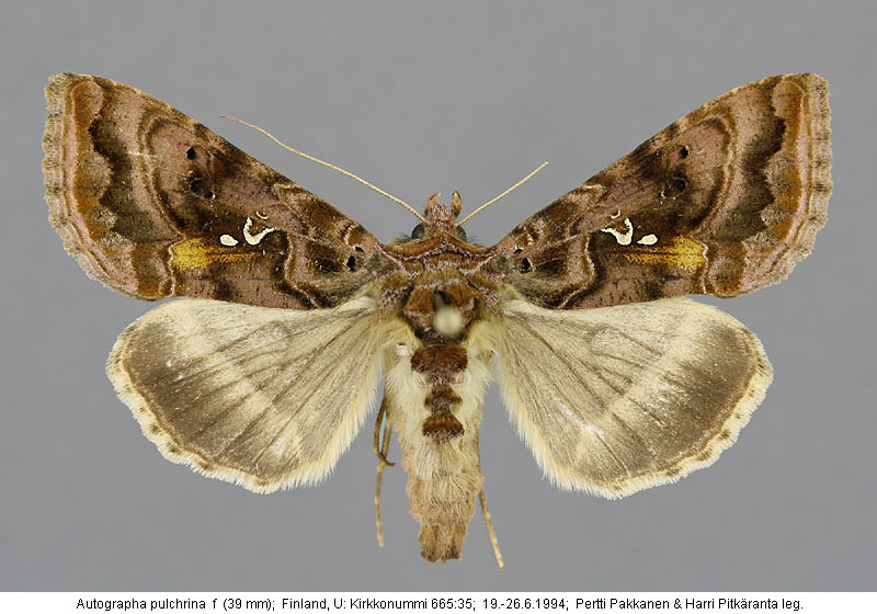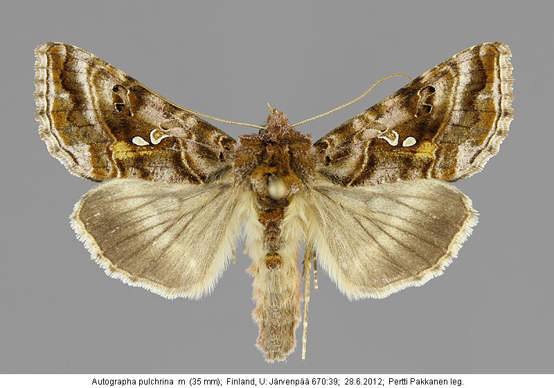 | Nykyinen voimassa oleva lajinimi - (Kullberg et. al. 2002): Autographa Hübner, 1821 pulchrina (Haworth, 1809) | ||||||||||||||||||