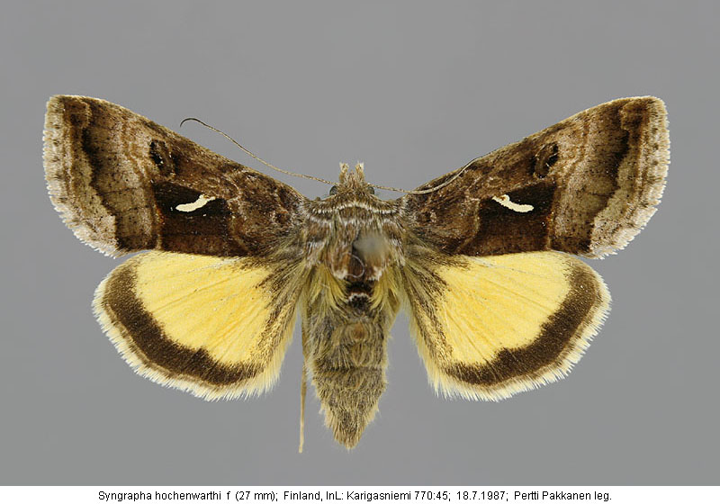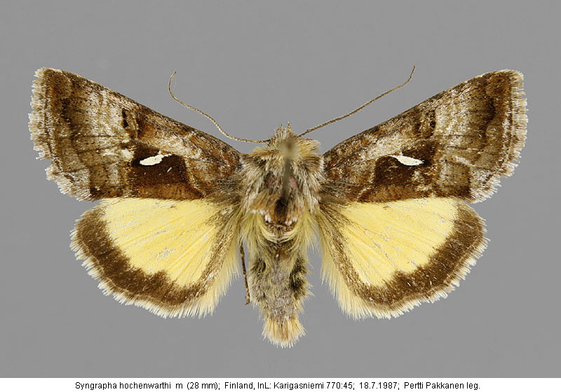 | Nykyinen voimassa oleva lajinimi - (Kullberg et. al. 2002): Syngrapha Hübner, 1821 hochenwarthi (Hochenwarth, 1785) | ||||||||||||||||||
