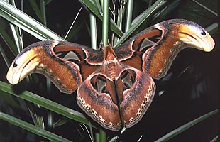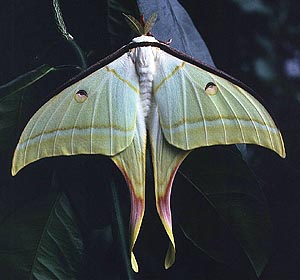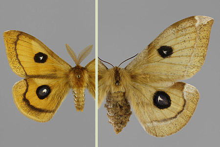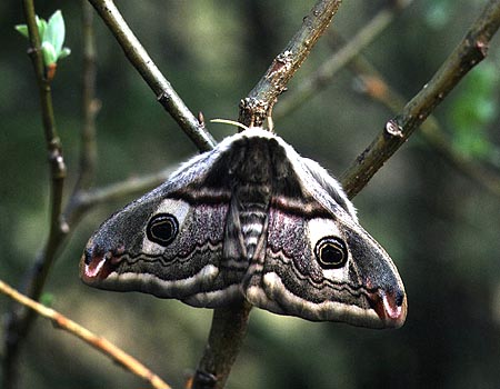Lepoasennossa siivet pidetään sivulle levitettyinä niin että takaruumis on hiukan näkyvissä. Riikinkukkokehrääjä naaras (Saturnia pavonia) |