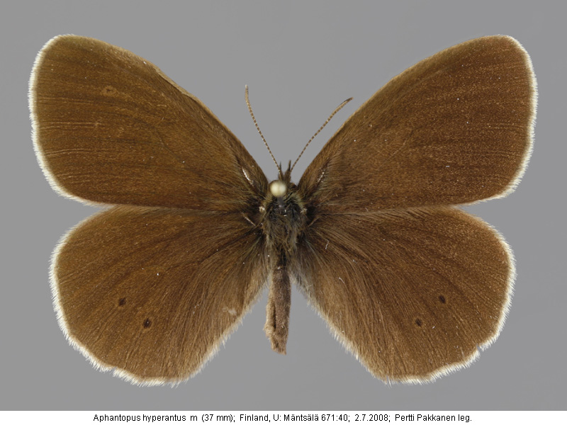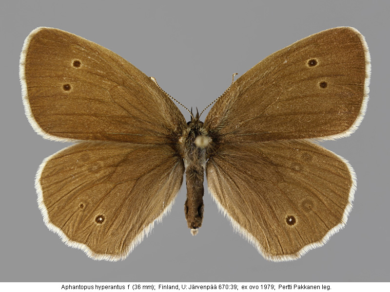 | Suomesta saaduiksi on ilmoitettu seuraavat muodot (alkuperäiset nimet): Aphantopus hyperantus - (Annales Zoologici Fennici 18:1-36 1981). - Raija Seppänen: Differences in spotting pattern between populations of Aphantopus hyperantus in southern Finland. (Lepidoptera, Satyridae). | ||||||||||||||||||||||||||||||