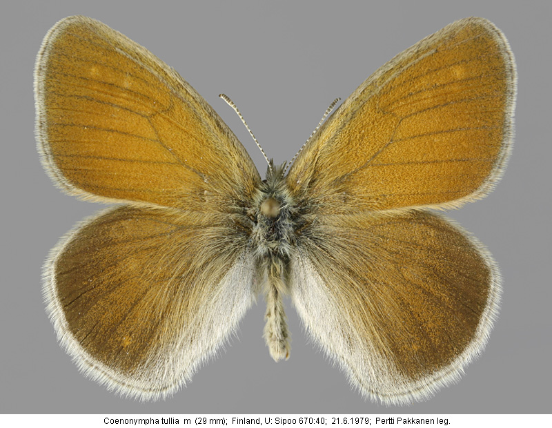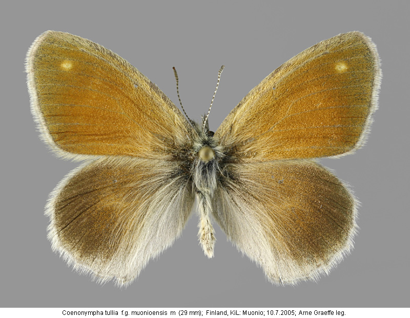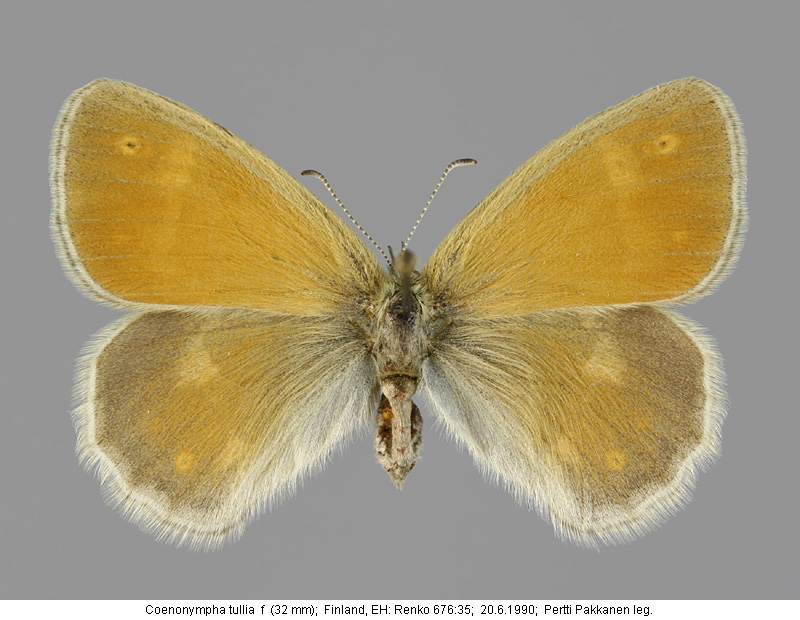 | Suomesta saaduiksi on ilmoitettu seuraavat muodot (alkuperäiset nimet): Coenonympha tiphon isis - (1930, Luonnon Ystävä 34(4):147.). - K.J.Valle: meillä tavataan vain muoto isis. Coenonympha tiphon var orstadii Whlgr. - (Kivirikko 1937) - faunallemme uusi muoto päiväperhosesta Coenonympha tiphon Rott. - 2 exx. Sallasta, 20.7.1934 ja 10.7.1937, J.Ritavuori leg. - molemmat siivet päältä yksivärisen tummanruskeanharmaat. - alapuolelta vaaleanharmaat. - silmätäplät puuttuvat kokonaan. - ripset kellanvalkeat. Coenonympha tullia ssp. isis - (Mannelin 1961). - pienempi ja tummempi kuin nimimuoto. - Etelä- ja Keski-Suomi. Coenonympha tullia ssp. orstadii - (Mannelin 1961). - silkinhohtoinen, tummanharmaa. - Lapissa. Coenonympha tullia ssp. muonioënsis - (Mannelin 1961). - harmaanruskea, voimakkaasti silkinhohtoinen ja valkoripsinen. - Muonionjoen laakso. Coenonympha tullia f.geogr. isis Thunberg, 1791 - (Sotavalta 1980). - muodostaa kliinin sekä nimimuodon että f.geogr. tiphonin (Baltian maat) kanssa. (kliini = vähitellen tapahtuva maantieteellinen muuntelu). Coenonympha tullia f.geogr. orstadii Wahlgren - (Sotavalta 1980). - silkinhohtoinen, tummanharmaa. - Pohjois-Suomi. Coenonympha tullia f.loc. muonioensis Lingonblad - (Sotavalta 1980). - harmaanruskea, voimakkaasti silkinhohtoinen ja valkoripsinen. - Pohjois-Suomi. Coenonympha tullia f. muonioensis - (Silvonen et.al. 2014). - siipiripset hopeanvalkoiset. - pohjoinen muoto. | ||||||||||||||||||||||||||||||