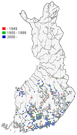 | Etelä-Suomi (A., V., U., EK., St., EH., ES., LK.) 11.-12.5.2002 U: Kirkkonummi 1 m J.Heinonen & T.Kämäräinen leg. - (J.Wettenhovi arkisto) 15.5.1990 EH: Hollola 1 ex. O.Blomster - (Suomen hyönteisten tietokanta) 16.8.1955 EH: Hämeenlinna - (Marttila et.al. 1996) 16.8.1991 ES: Mäntyharju - (Marttila et.al. 1996) Keski-Suomi (EP., PH., PS., PK., KP., Kn., PPe.) 21.5.2002 PS: Kuopio 1 ex. J.Kelo - (Suomen hyönteisten tietokanta) II sukupolvi 1.9.1988 EK: Anjalankoski - (Marttila et.al. 1996) 8.-10.9.2007 EK: Virolahti 1 ex. M.Montonen - (Suomen hyönteisten tietokanta) 2.-8.10.2000 PS: Iisalmi 1 m O.Valta - (J.Wettenhovi arkisto) | ||||||||||||||||||||||||||